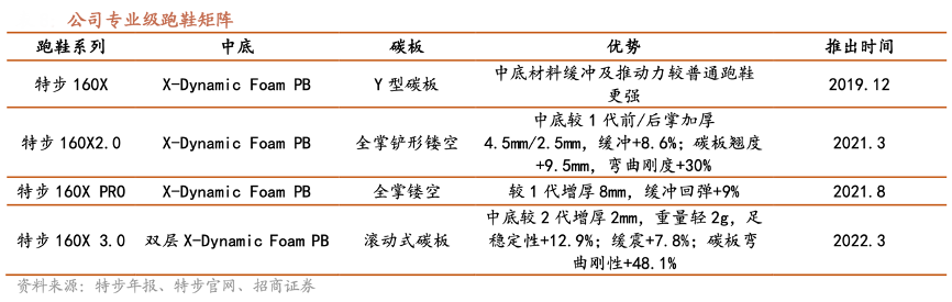 經典案例:根據特步年報、特步官網、招商證券等綜合資訊表明,以 160x 系列為例,自 2019 年 12 月推出 160X 以來持續進行升級,特步第三代在 X-Dynamic Foam PB 中底材料的密度和彈性上進一步優化,采用獨特的三明治結構,較二代具備更強的推動力,足穩定性提升12.9%,緩震效果提升 7.8%。