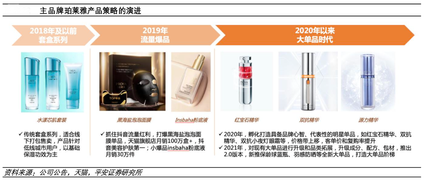 經典案例:根據公司公告、天貓、平安證券研究所等綜合資訊表明,珀萊雅作為線下老牌國貨,2020年,公司執行大單品策略,先后推出紅寶石精華、雙抗精華、雙抗眼霜、紅寶石面霜,全年新品收入占比接近 20%。2021 年,公司進一步迭代大單品,升級成分、配方、包裝,鞏固大單品市場地位,并持續推新以擴充大單品矩陣,延展至次拋、面膜等品類,全年大單品收入占比增至 25%+。