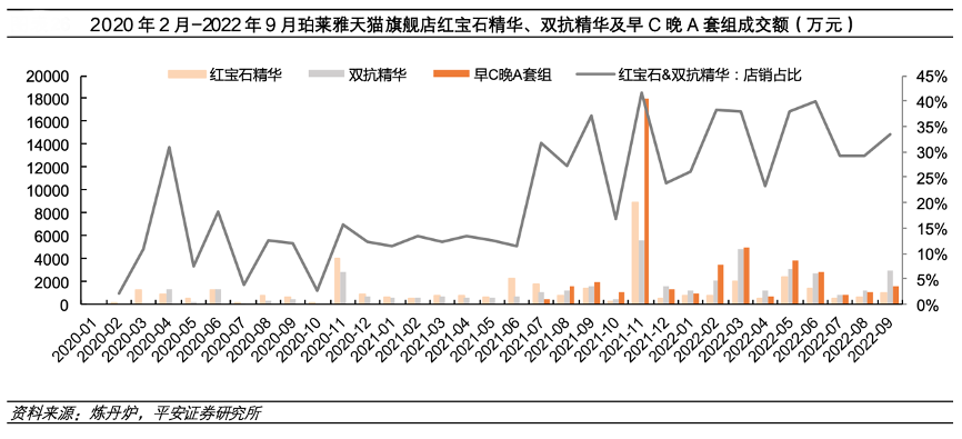 經典案例:根據煉丹爐、平安證券研究所等綜合資訊表明,“早C晚A”即早上使用使用含維C類成分的護膚品,晚間使用含維 A 類成分的護膚品,兩者結合使用,既能美白提亮皮膚,也能有效抵抗皮膚老化,被稱作“神仙抗老 CP”。 2021 年 7 月開始,珀萊雅結合該理念推廣雙抗精華&紅寶石精華套組,并在雙十一期間迎來大爆發。據煉丹爐數據,2021 年 11 月珀萊雅雙抗&紅寶石精華合計銷售額超過 3 億,占店鋪總銷售額的 40%+,其中早C 晚 A 套組占比20%+。