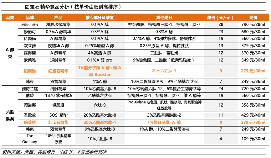 經(jīng)典案例:根據(jù)天貓、美麗修行、小紅書(shū)、平安證券研究所等綜合資訊表明,為保證抗衰功效+減輕對(duì)皮膚的刺激,珀萊雅公司研發(fā)超分子維 A 醇包裹緩釋專利技術(shù),使維 A 醇釋放濃度維持在對(duì)皮膚傷害最小的水平,成為其差異化競(jìng)爭(zhēng)優(yōu)勢(shì)。價(jià)格上看,珀萊雅紅寶石精華每毫升定價(jià)約為 9 元,低于歐萊雅、露得清競(jìng)品的 12-13 元,疊加濃度高達(dá)20%的高端抗衰成分六勝肽加持,整體頗具性價(jià)比。