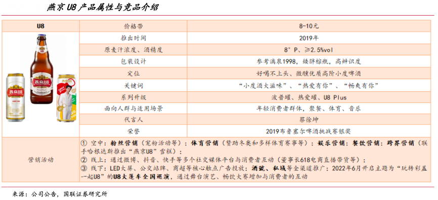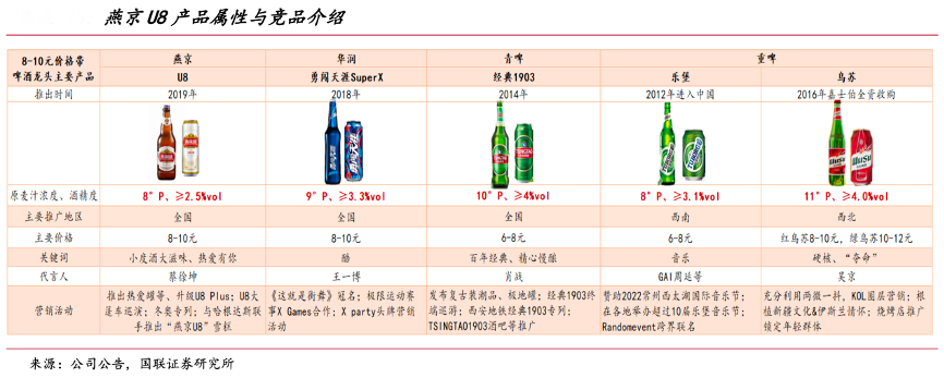 經典案例:根據公司公告、國聯證券研究所等綜合資訊表明,與主要競品華潤啤酒 SuperX、青島啤酒經典1903、重慶啤酒樂堡和烏蘇相比,U8以“矮胖棕瓶”提高辨識度,以拉環瓶蓋提升消費者開瓶體驗,以低度、不上頭的清爽口感為差異化賣點,符合年輕消費者追求新奇與微醺的需求。