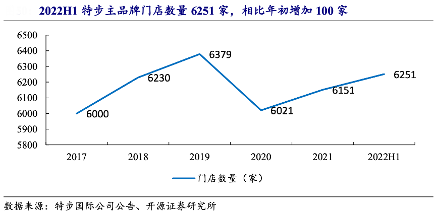 經典案例:根據特步國際公司公告、開源證券研究所等綜合資訊表明,截至2022H1,特步主品牌店數為 6251 家,相比年初凈開店 100 家,同比 2021H1 凈開店 236 家,其中新開九代店數量較多,同比 2021H1 九代店增加1000 家,目前九代店占比約為33%。主力市場三四線城市的門店數量約占總店數的 70%,一二線門店數量占比約為20%。