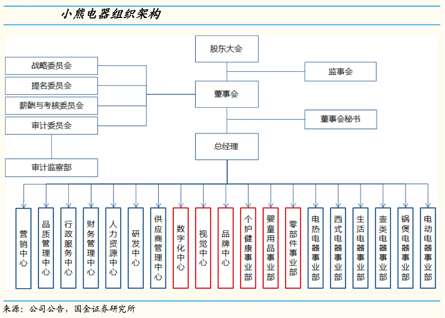 經(jīng)典案例:根據(jù)公司公告、國(guó)金證券研究部等綜合資訊表明,2021年12月小熊電器公司為優(yōu)化管理提升效率,對(duì)組織架構(gòu)進(jìn)行調(diào)整,本輪調(diào)整主要新增“數(shù)字化中心”、“ 視覺(jué)中心”、“品牌中心”,此輪調(diào)整為公司品牌戰(zhàn) 略升級(jí)規(guī)劃打好內(nèi)部底層建筑,數(shù)字化中心突顯公司對(duì)數(shù)字化能力構(gòu)建的重視,視覺(jué)中心有助于更好助推產(chǎn)品精品化策略。