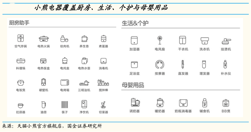 經(jīng)典案例:根據(jù)天貓小熊官方旗艦店、中信證券研究部等綜合資訊表明,小熊以酸奶機(jī)起家,發(fā)展至今覆蓋廚房小家電、生活小家電和其他小家電,產(chǎn)品超 60 個(gè)品類,已基本覆蓋各類主流剛需與長(zhǎng)尾創(chuàng)意小家電產(chǎn)品。目前小熊在長(zhǎng) 尾品類優(yōu)勢(shì)突出,煮蛋器、酸奶機(jī)、電熱飯盒、電烤爐、打蛋器、吐司機(jī)等品類份額居前。