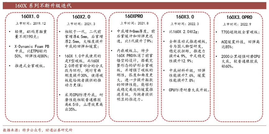 經典案例:根據特步公眾號、財通證券研究所等綜合資訊表明,在獲得積極的市場反饋后,特步對 160X 跑鞋進行進一步升級,以 6 個月左右的迭代頻率推出全新版本,對回彈、緩震、推動等性能進行進一步加強,2022年 9 月 160X 系列已推出 3.0PRO 版本。冠軍跑鞋的持續升級體現出公司日益成熟的產品迭代思路。