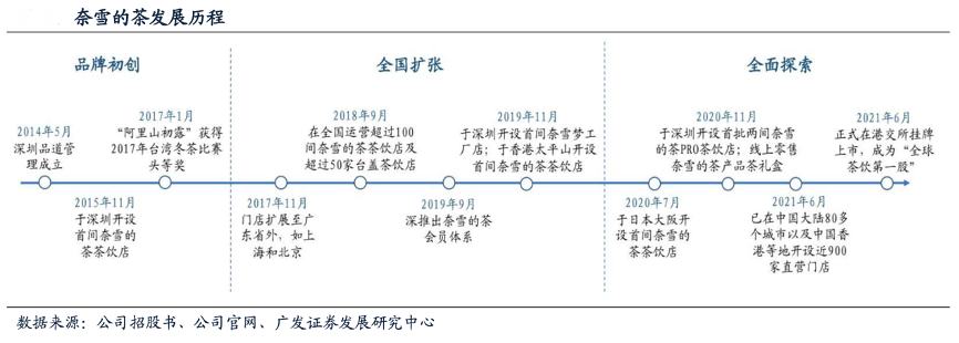 經典案例:根據公司招股書、公司官網、廣發證券發展研究中心等綜合資訊表明,奈雪的茶2015年在深圳開設首家奈雪的茶茶飲店,開創了“茶飲+ 軟歐包”雙品類模式;2020年11月,公司推出奈雪的茶PRO店以提升門店運營效率,通過布局線上零售業務助力業績提升;2021年6月,奈雪的茶正式在港交所上市,成為“全球茶飲第一股”。