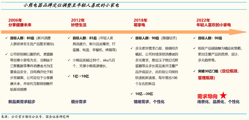 經典案例:根據公司官方微信公眾號、國金證券研究所等綜合資訊表明,困境之下小熊公司積極求變,22 年升級新定位致力成為年輕人喜歡的小家電品牌,相應產品端調整為精品化策略,更加注重產品的質感、設計、多元趨勢等。