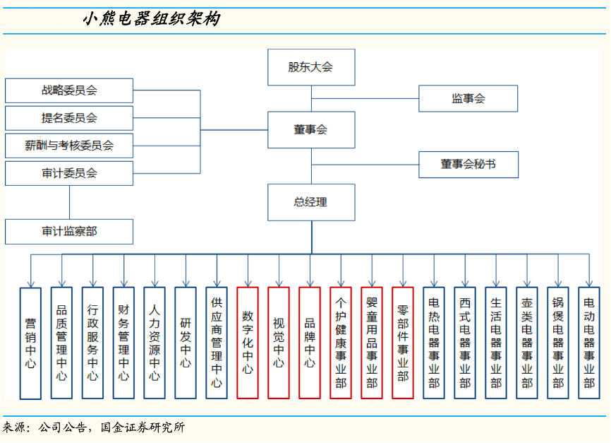 經典案例:根據公司公告、國金證券研究所等綜合資訊表明,2021年12月小熊熊公司對組織架構進行調整,本輪調整主要新增“數字化中心”、“視覺中心”、“品牌中心”,數字化中心突顯公司對 數字化能力構建的重視,視覺中心有助于更好助推產品精品化策略。