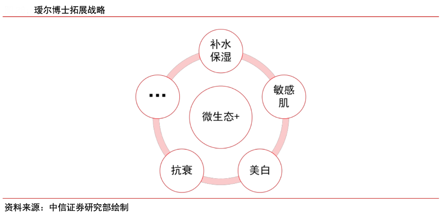 經典案例:根據中信證券研究部等綜合資訊表明,璦爾博士圍繞皮膚微生態,逐步探索皮膚微生態與補水保濕、敏感肌、美白、抗衰等功能的關系;在品類內部,璦爾博士著力打造優勢產品,提升品類滲透擊穿品類。