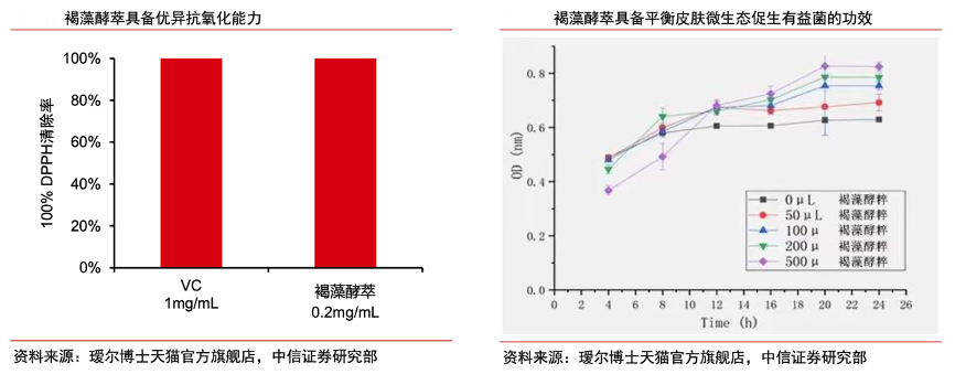 經典案例:根據璦爾博士天貓官方旗艦店、中信證券研究部等綜合資訊表明, 2018 年 6 月,璦爾博士公司合作方齊魯工業大學將褐藻精粹制備方法“益生菌發酵制備海藻 發酵液的方法及該海藻發酵液在化妝品中的應用”申請國家發明專利,實施例證明璦爾博士益生菌發酵制備的海藻發酵液活性成分種類和含量高。2022 年,褐藻成分也登陸美麗修行聯合中國國家地理拍攝的紀錄片《這就是中國成分》,紀錄片詳細記錄了褐藻酵萃的研發過程,成為中國特色功效成分的一張名片。