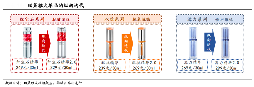 經(jīng)典案例:根據(jù)珀萊雅天貓官方旗艦店、華福證券研究所等綜合資訊表明,珀萊雅初推大單品時憑借極致性價比在精華品類的競爭紅海中突出重圍,聚焦消 費者護膚痛點,2020年 2 月和 4 月其接連推出主打抗皺淡紋功效的紅寶石精華、主打抗氧抗糖功效的雙抗精華,后續(xù)通過縱向迭代,升級配方和產(chǎn)品使用感,產(chǎn)品價格進階。