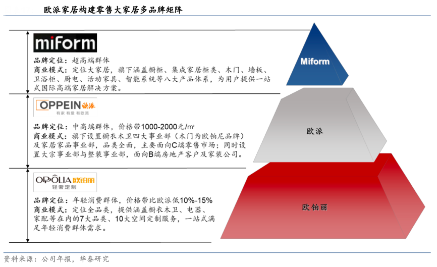 經典案例:根據公司年報、華泰研究等綜合資訊表明,通過產品設計與價格帶的分層,歐派公司旗下已建立覆蓋從超高端到年輕化消費群體的全品牌矩陣,其中歐派主品牌為體,定位中高端消費人群,向整家一體化銷售邁進;歐鉑麗定位年輕一代消費群體,在同類品牌中已率先跑通;Miform傳承自意大利高端家居品牌 FORMER,卡位品牌制高點,定位高凈值人群。