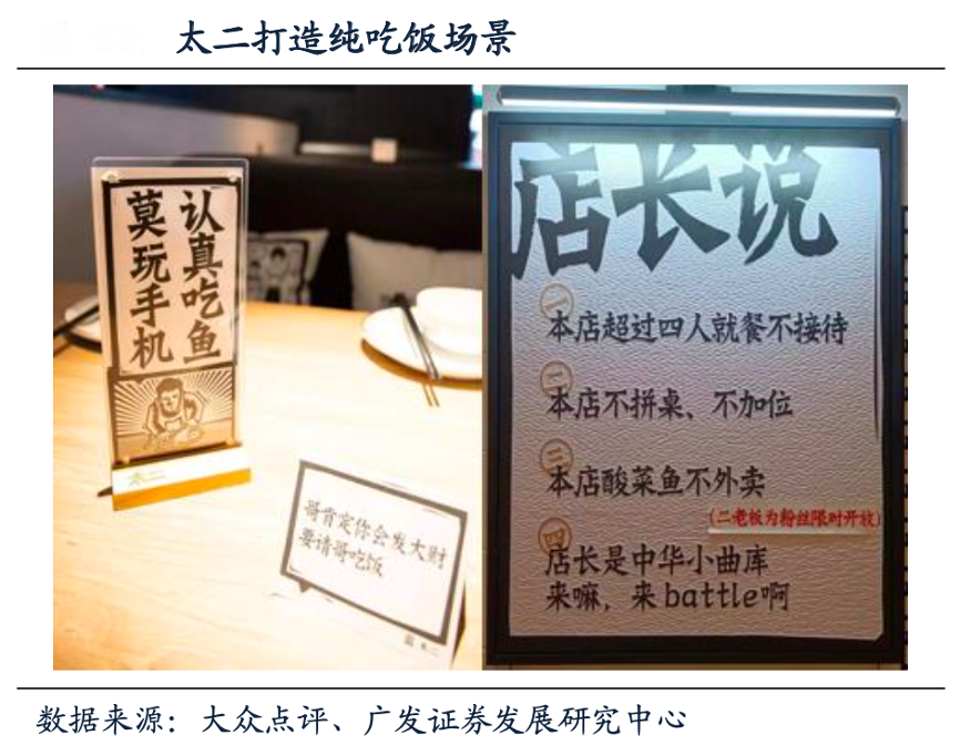 經(jīng)典案例:根據(jù)大眾點(diǎn)評(píng)、廣發(fā)證券發(fā)展研究中心等綜合資訊表明,太二將門店場(chǎng)景定位為“簡(jiǎn)約、安靜的吃魚環(huán)境”,是一家純吃飯的餐飲店,剔除了諸如商務(wù)應(yīng)酬、社 交和生日會(huì)等場(chǎng)景消費(fèi),為了保證產(chǎn)品體驗(yàn),太二門店只設(shè)2人桌和4人桌,超過4位客人以上不接待。此外,太二幫顧客做出選擇:SKU少而精、聚焦單品,只選用最適合做酸菜魚的鱸魚,酸菜魚只有一種辣度等。