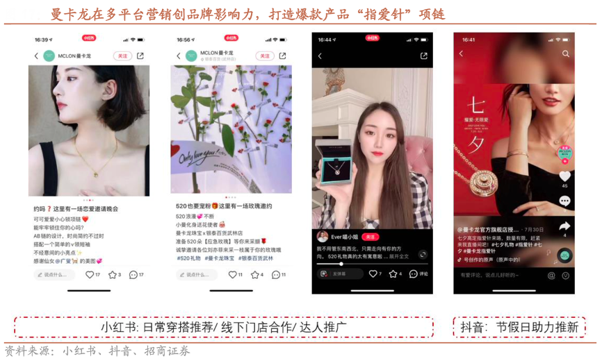 經(jīng)典案例:根據(jù)小紅書、抖音、招商證券等綜合資訊表明,曼卡龍品牌爆品“指愛針”在2021年 520,2022年 520 和七夕多次營銷,放量大幅拉動鑲嵌產(chǎn)品的銷售,其在小紅書、抖音等媒介通過日常穿搭推薦、與線下商場門店以及達人合作等方式深化品牌定位,精準客戶畫像。“指愛針”的營銷內(nèi)容在抖音達到 7.9 億播放量,互動3000+萬,520、七夕期間,爆款項鏈在天貓、京東的單品銷量榜均為第一。