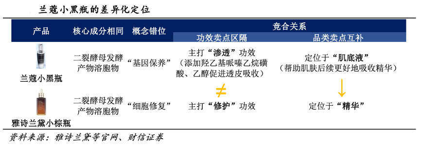 經(jīng)典案例:根據(jù)雅詩蘭黛官網(wǎng)、財信證券等綜合資訊表明,以誕生于 2009 年的蘭蔻經(jīng)典大單品小黑瓶為例,其主打“基因保養(yǎng)”概念與小棕瓶的“細胞修復(fù)”概念形成一定錯位,且巧妙地將品類賣點定位于“肌底液”(幫助肌膚后續(xù)更好地吸收精華)、功效賣點定位于“滲透”,與先發(fā)者小棕瓶形成一定的競合關(guān)系,推出后連續(xù)斬獲了 65 項美容大獎。