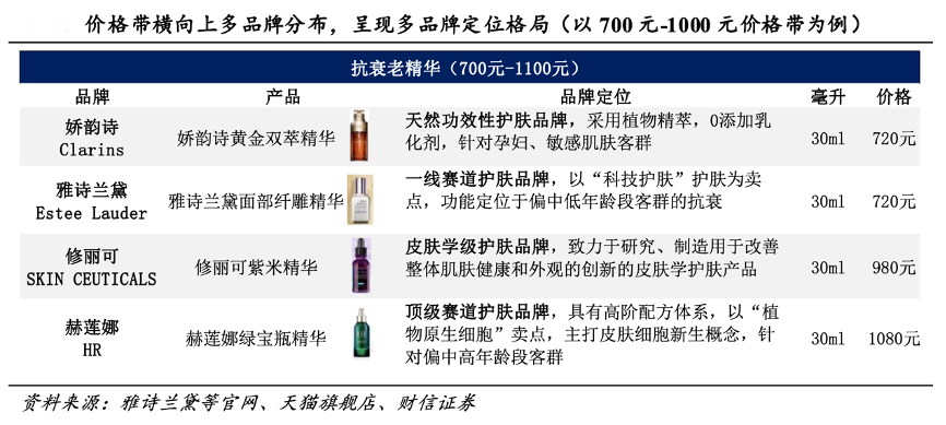經(jīng)典案例:根據(jù)雅詩蘭黛等官網(wǎng)、天貓旗艦店、財信證券等綜合資訊表明,鑒于單一品牌天花板有限,化妝品企業(yè)在成功孵化單品牌后,通常會進階至以多品牌矩陣為核心的集團化發(fā)展。綜合化妝品的三大品種屬性來看,在任何一個屬性維度上都能延伸出繁多細分需求,行業(yè)需求端的高度個性化奠定了供給端的多品牌格局。