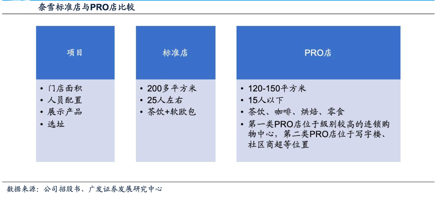 經典案例:根據公司招股書、廣發證券發展研究中心等綜合資訊表明,奈雪公司自2020年11月推出奈雪的茶PRO店。相較于奈雪的茶標準店,奈雪PRO店移除了現場面包房區域,門店面積更小,人員配置更少,租金及人工成本更低。此外,PRO店產品類別更加多樣,且在選址上更加靈活,不僅可以布局于連鎖購物中心,還能進駐寫字樓、社區等標準店較難進入的區域。