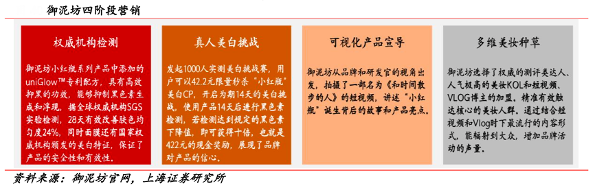 經(jīng)典案例:根據(jù)御泥坊官網(wǎng)、上海證券研究所等綜合資訊表明,御泥坊通過(guò)明星影視代言、KOL種草帶貨到與用戶一起打造單品三個(gè)階段的不斷成長(zhǎng),超膜節(jié)目前已成為御泥坊品牌的專(zhuān)屬節(jié)日。在最近 422 超膜節(jié)上, 針對(duì)新品小紅瓶美白系列的上新,御泥坊開(kāi)展了四個(gè)階段漸進(jìn)性 的營(yíng)銷(xiāo)傳播活動(dòng),步步為營(yíng)地傳達(dá)產(chǎn)品的功能、體驗(yàn)?zāi)酥僚c品牌的情感聯(lián)結(jié),最終達(dá)成 422 超膜節(jié)用戶心智的占領(lǐng)。