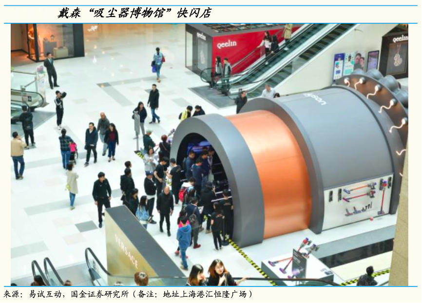 經典案例:根據易試互動、國金證券研究所等綜合資訊表明,借鑒美妝品牌快閃路演(pop-up),戴森是 3C 電器行業第一個做快閃的品牌。核心商圈 pop up 深度契合戴森的營銷訴求,通過將快閃店打造成體驗產品的小型入口,進一步加強快閃店的交互屬性,最大可能吸引潛在客戶試用戴森產品。戴森于2016 年全面展開快閃店計劃,2017、2018 年分別實現 250+、400+次快閃店 活動。