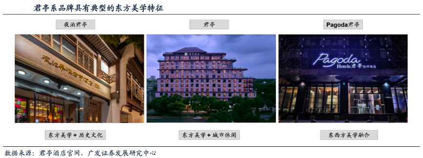 經(jīng)典案例:根據(jù)君亭酒店官網(wǎng)、廣發(fā)證券發(fā)展研究中心等綜合資訊表明,君亭系酒店品牌具有典型的東方美學(xué)文化特征,定位始終圍繞著“聚焦寫意東方,沉浸都市謐園”的核心主線,由此衍生出三大酒店品牌— —君亭、夜泊君亭、Pagoda君亭。其中,“君亭”結(jié)合城市休閑和東方文化特色;“夜泊君亭”以城市歷史文化為基石,創(chuàng)作具有鮮明文化特征的酒店建筑;“Pagoda君亭”融合東西方美學(xué),兼具國際品質(zhì)基因和中國城市文化。