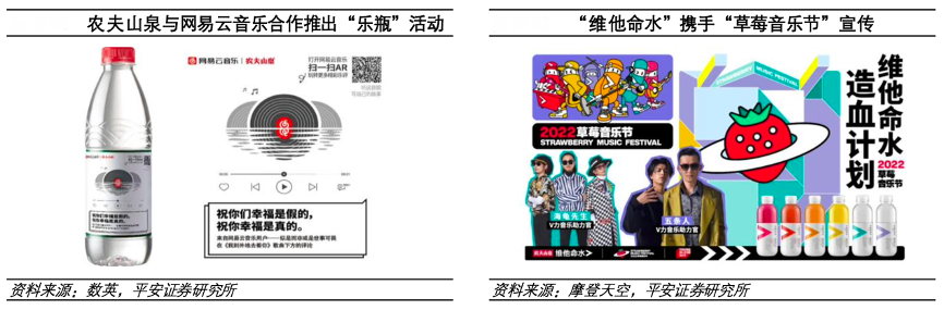 經(jīng)典案例:根據(jù)數(shù)英、摩登天空、平安證券研究所等綜合資訊表明,農(nóng)夫山泉2017 年與網(wǎng)易云音樂合作推出“樂瓶”聯(lián)名活動(dòng),精選了 52 條音樂評(píng)論并印制在樂瓶瓶身,在本活動(dòng)中推出約4億瓶“有故事的水”引發(fā)消費(fèi)者強(qiáng)烈的情感共鳴。同時(shí),2021-2022年,公司旗下“維他命水”攜手“草莓音樂節(jié)”、“草莓 MDSK 音樂節(jié)”宣傳,進(jìn)一步提高了品牌在年輕消費(fèi)者中的知名度。