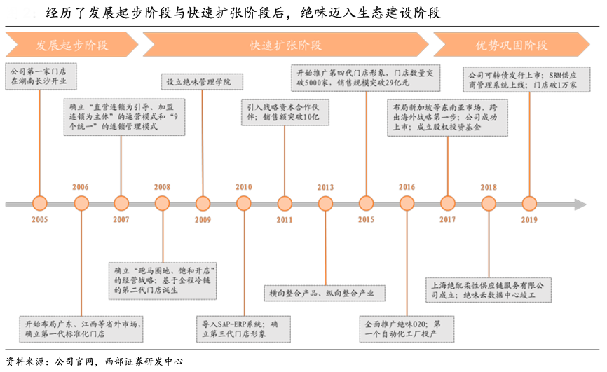 經典案例:根據公司官網、西部證券研發中心等綜合資訊表明,絕味食品公司專注于休閑鹵制食品的研發、生產與銷售,是休閑鹵制食品行業的領軍企業, 截至 2021 年,公司在中國大陸地區門店數達 13714 家,零售規模領跑同行,旗下“絕味鴨脖”品牌已成為鴨脖連鎖領域的領導品牌。