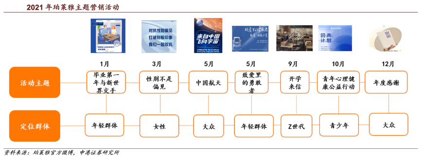 經典案例:根據珀萊雅官方微博、申港證券研究所等綜合資訊表明,珀萊雅 2021 年各月份先后開展主題營 銷活動,與用戶深度對話。其在1月“畢業第一年”活動面向年輕職場人群,10月聯合《中國青年報》、壹心理發起“珀萊雅 青年心理健康公益行動-回聲計劃”,聚焦青少年成長,彰顯品牌社會責任擔當;12 月年度感謝活動收集 76 條用戶聲音,制作新年卡片贈予消費者。