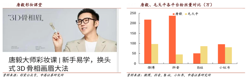 經典案例:根據彩棠公眾號、微博、抖音、B站、小紅書、申港證券研究所等綜合資訊表明,彩棠公眾號上持續開設唐毅大師系列彩妝教學,連接用戶提升品牌傳播度。相比同樣擁有自主品牌的明星化妝師毛戈平,唐毅在微博、抖音、小紅書上的粉絲量分別為 218.5 萬、237.8 萬、96.2 萬,均高于毛戈 平。