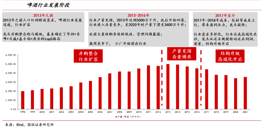 經(jīng)典案例:根據(jù)ifind、國聯(lián)證券研究所等綜合資訊表明,從產(chǎn)量和企業(yè)戰(zhàn)略角度復盤,啤酒行業(yè)的發(fā)展可以分為三個階段:2013 年之前,行業(yè)處于持續(xù)擴容期,各龍頭公司跑馬圈地,基本形成了行業(yè)前五的競爭格局; 2013-2016 年,行業(yè)產(chǎn)量達到 5000 萬千升后見頂,并購導致的低效率等問題開始暴露,龍頭公司歷史包袱沉重,行業(yè)開啟激烈的存量競爭,部分小廠退出;2017 年至今,龍頭公司達成高端化共識,從追求規(guī)模轉向追 求質(zhì)量和利潤,行業(yè)進入結構升級階段。