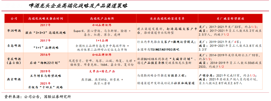 經(jīng)典案例:根據(jù)公司公告、國聯(lián)證券研究所等綜合資訊表明,在行業(yè)產(chǎn)量見頂?shù)谌旰螅?016年重慶啤酒在行業(yè)內(nèi)率先提出了高端化戰(zhàn)略“揚帆 22 計劃”,2017年華潤啤酒和青島啤酒緊隨其后,分別提出“3+3+3”戰(zhàn)略、開啟“1+1”品牌戰(zhàn)略。至此,高端化成為啤酒行業(yè)共識,龍頭公司紛紛轉向高端化競爭,開啟產(chǎn)品和渠道高端化,提升品牌形象的同時加速提效減虧,追求高質(zhì)量發(fā)展。