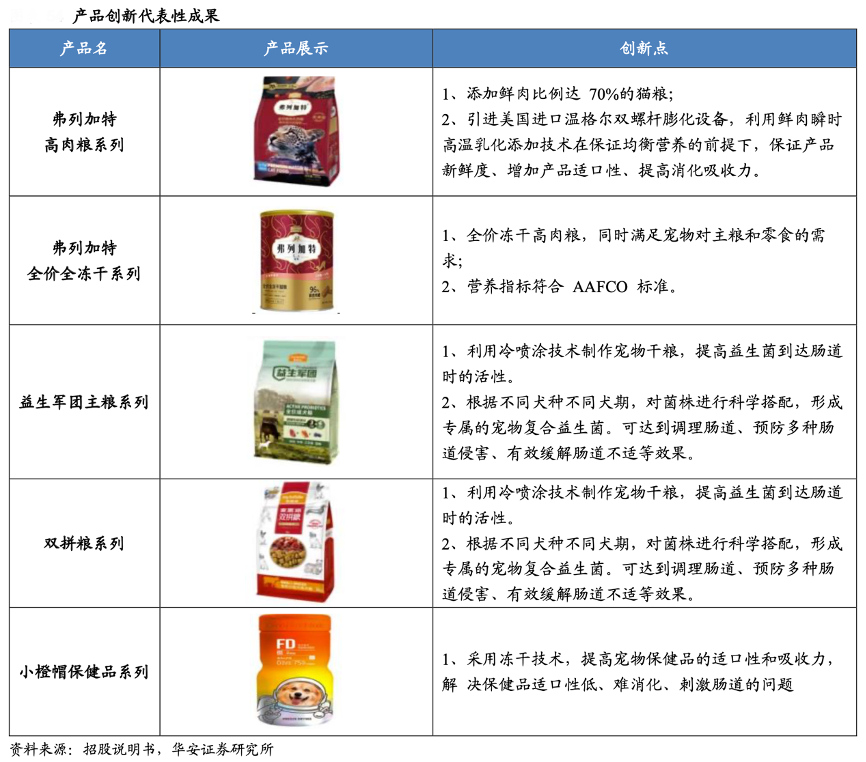 經典案例:根據招股說明書、華安證券研究所等綜合資訊表明,基于完善的產品研發流程和人才激勵機制,“麥富迪”產品不斷推陳出新,相繼開發出弗列加特高肉貓糧系列、弗列加特全價凍干貓糧系列、雙拼糧系列、益生軍團系列等多個創新產品系列,逐漸成為產品系列最豐富的國產品牌之一。