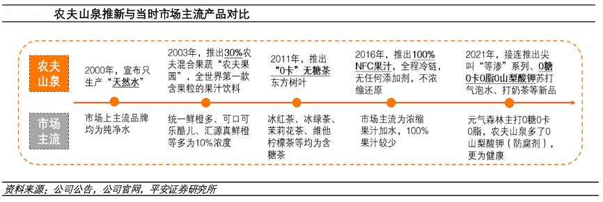 經(jīng)典案例:根據(jù)公司公告、公司官網(wǎng)、平安證券研究所等綜合資訊表明,農(nóng)夫山泉公司的產(chǎn)品關(guān)注消費(fèi)者長(zhǎng)期健康的需求,推新會(huì)以更長(zhǎng)的時(shí)間維度去布局,在行業(yè)盛行 10%低濃度果汁飲料時(shí),公司在 2003 年即推出 30%濃度的混合果蔬汁飲料 “農(nóng)夫果園”,是全世界第一款含果粒的果汁飲料。