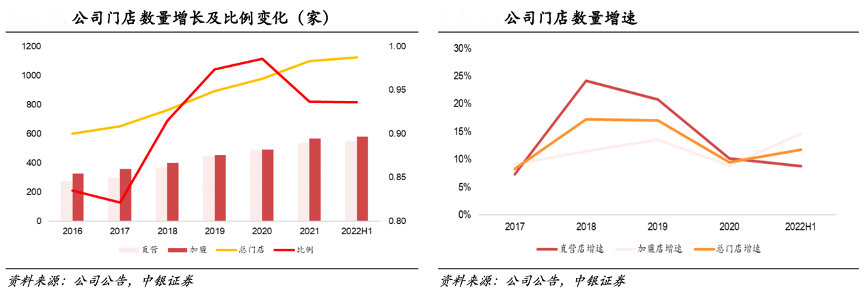 經典案例:根據公司公告、中銀證券等綜合資訊表明,截至2022年6月30日,比音勒芬公司線下營銷網絡覆蓋全國31個省、自治區及直轄市的核心商圈、高端百貨、機場、知名高爾夫球會會所等,門店總數達 1125 家,其中直營店鋪 544 家,加盟店鋪 581 家,直營加盟比例接近 1:1,門店總數由 2016 年的 602 家 擴張至 2021 年的 1100 家,凈增 498 家。