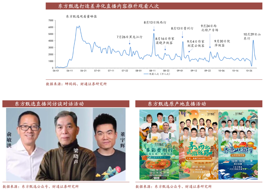 經典案例:根據蟬媽媽、東方甄選公眾號、財通證券研究所等綜合資訊表明,回顧東方甄選觀看人次變動趨勢,在 6 月 18 日單場場觀人次達到頂峰 后,場觀人次逐漸回落至高值,其通過戶外原產地直播、名人訪談對話形式拉 升直播間觀看人次。