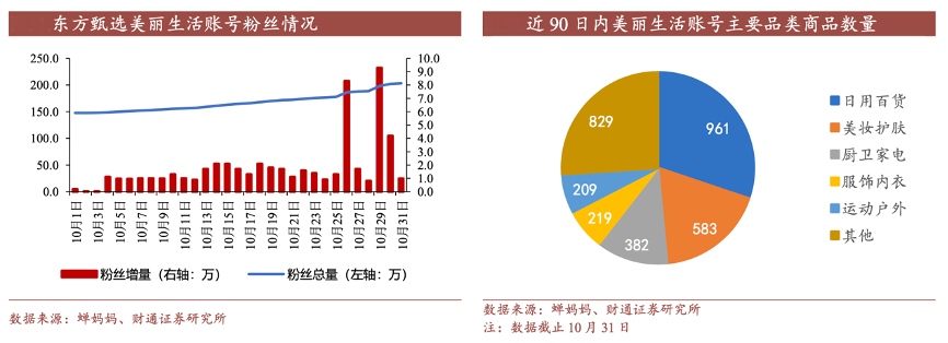 經典案例:根據蟬媽媽、財通證券研究所等綜合資訊表明,美麗生活賬號粉絲數量穩步提升,在大促活動有較大幅度的增長,其直播間入駐美妝大牌數量持續增長,已上架商品中包含歐萊雅、Olay、SK-2 等美妝大牌,該賬號在雙十一美妝專場直播中單日 GMV 達到 6800 萬元,印證了其增長潛力。