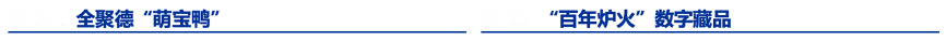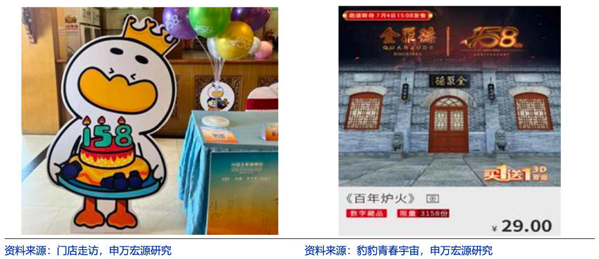 經(jīng)典案例:根據(jù)門店走訪、豹豹青春宇宙、申萬宏源研究等綜合資訊表明,全聚德于 157 周年活動(dòng)上推 出全新IP 形象“萌寶鴨”,受到年輕消費(fèi)者喜愛。公司進(jìn)一步豐富“萌寶鴨”IP 內(nèi)容,延 伸打造品牌文化傳播新項(xiàng)目“萌寶星廚直播間”,通過動(dòng)漫短視頻的形式,講述美食美味的秘密。同時(shí)全聚德于今年周年慶上啟動(dòng)“數(shù)字藏品”發(fā)售儀式,藏品包括 1 款“百年?duì)t火” 視頻和 6 款萌寶鴨造型盲盒。