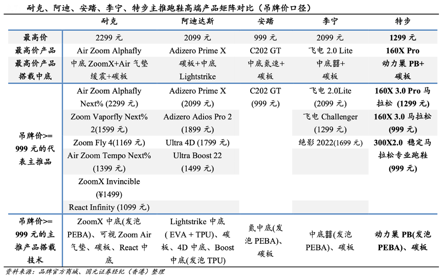 經典案例:根據品牌官方商城、國元證券經紀(香港)等綜合資訊表明,特步在 201-400 元的價格帶上較鴻星爾克等其他中小品牌占優。結合久謙數據,2022 年 1-9 月特步/361 度/鴻星爾克天貓艦旗店分別有 36%/ 23% /25%的成交額來自于 201-400 元商品。