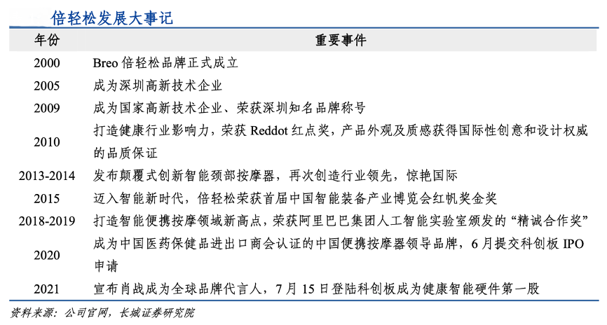 經(jīng)典案例:根據(jù)公司官網(wǎng)、長(zhǎng)城證券研究院等綜合資訊表明,倍輕松公司自成立以來(lái)便專注于小型便攜智能按摩器具的設(shè)計(jì)、研發(fā)、生產(chǎn)、銷售及服務(wù),經(jīng)過(guò)二十余載的耕耘,公司先后獲得境內(nèi)外重要獎(jiǎng)項(xiàng)十余項(xiàng),成為中國(guó)智能按摩器具行業(yè)領(lǐng)軍企業(yè)。2021 年 7 月 15 日,公司成功 IPO,成為我國(guó)健康智能硬件第一股。