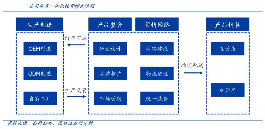 經典案例:根據公司公告、國盛證券研究所等綜合資訊表明,牧高笛得益于自有供應鏈,其打造從上游制造、品牌運營、下游銷售營銷為一體化的自有品 牌經營模式。上游產品制造采用自主生產+外協加工的模式,下游銷售渠道主要包括電子商務(大牧)、專業戶外店及團購(大牧)、加盟店(小牧)、直營店(小牧)渠道。