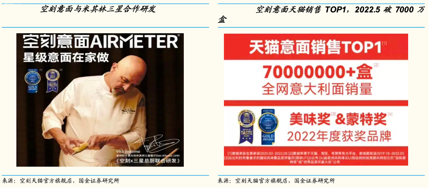 經典案例:根據空刻天貓官方旗艦店、國金證券研究所等綜合資訊表明,空刻意面具備濃厚的互聯網基因,定位新銳白領、資深中產和精致寶媽,通過廣告瞄定、包裝設計、KOL 帶貨等方式直擊消費人群。在 KOL 營銷方面,2020 年 10 月公司嘗試與頂流主播合作,取得了 1 分鐘 7 萬盒售罄的成績。據天貓官方旗艦店數據顯示,2019.10-2022.5 空刻銷售額破 7000 萬盒。