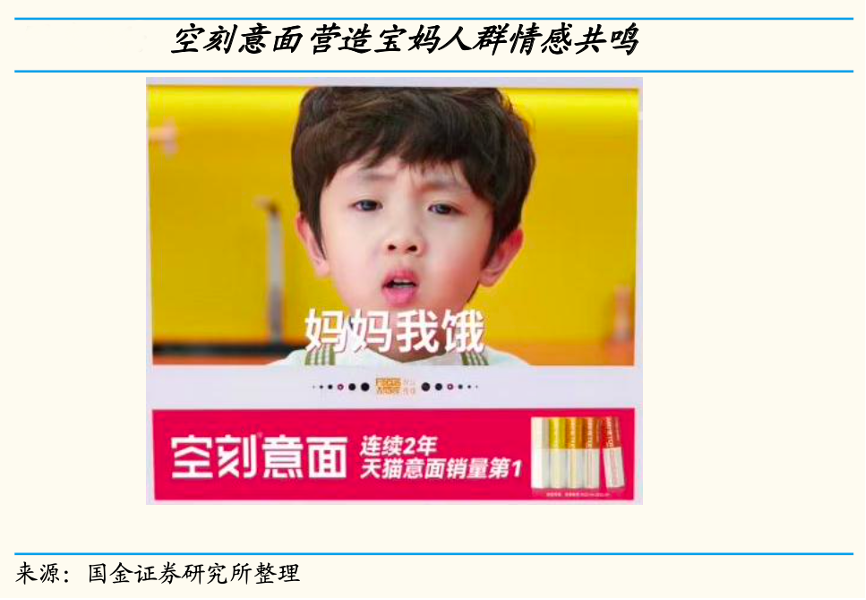 經典案例:根據國金證券研究所等綜合資訊表明,面對精致寶媽,空刻抓住“愛孩子”、“注重產品健康安全”等特點,以電媒“媽媽我餓”等廣告詞,營造寶媽情感共鳴。