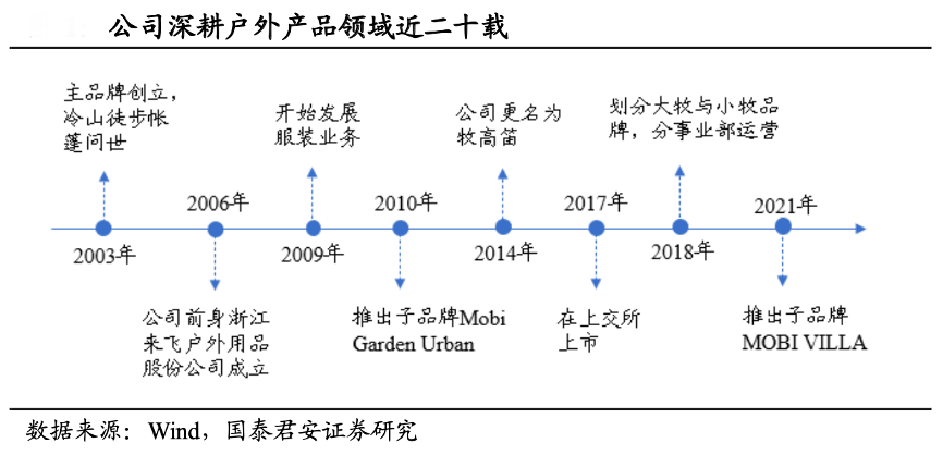 經典案例:根據wind、國泰君安證券研究等綜合資訊表明,牧高笛專注露營裝備制造近二十載,2003年,主品牌MOBI GARDEN 成立,“冷山”徒步帳篷問世并迅速成為中國徒步露營的標志性產品。2006年公司前身浙江來飛戶外用品股份公司成立,2014年公司更名為牧高笛,并于 2017 年成功上市。