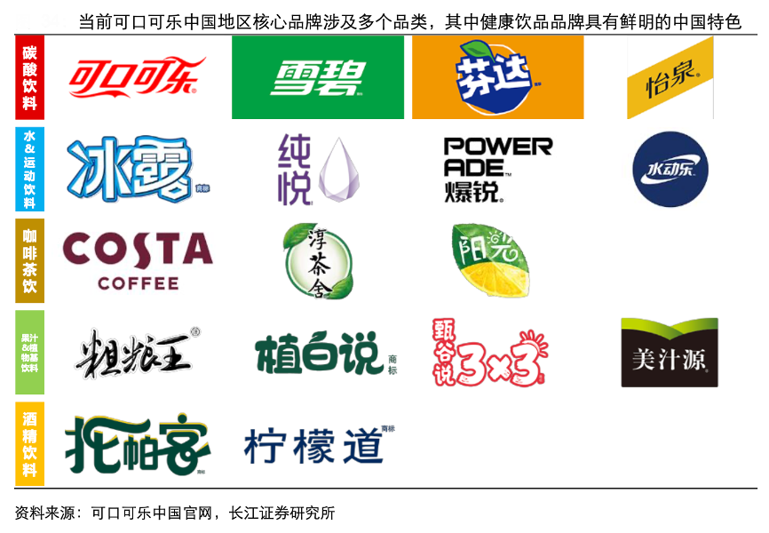經典案例:根據可口可樂中國官網、長江證券研究所等綜合資訊表明,為應對中國市場消費者消費習慣與美國市場的差異,可口可樂公司在早期引進可樂、雪碧及芬達后就逐步開始開拓其他細分賽道的布局。當前,經過不斷的創新孵化、收購與淘汰,可口可樂中國地區為消費者提供 20 個以上的品牌產品。