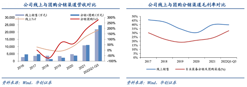 同時,公司非常重視線下渠道,客戶包括零售店、綜合體、同時擁有 線上線下渠道的成熟客戶(如三夫戶外)、營地進行直接采購以及大型商超(如山姆)等, 22Q1-Q3 分銷售團購銷售 2.47 億元(YoY+279.56%),毛利率32.53%。