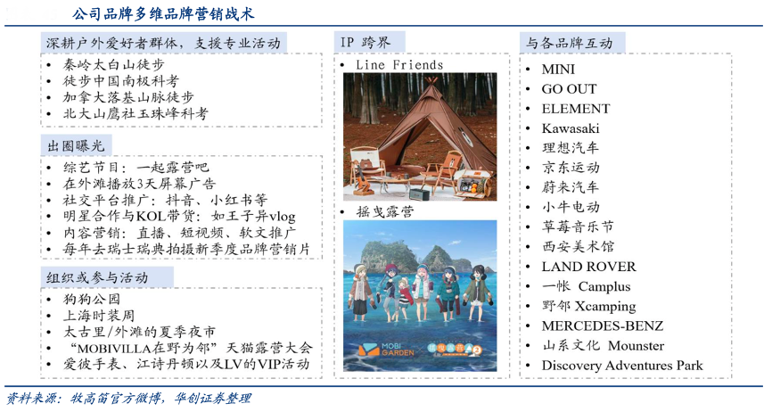 經典案例:根據牧高笛官方微博、華創證券等綜合資訊表明,除帳篷的迭代升級以外,牧高笛公司同時不斷擴展周邊產品,圍繞精致露營,開發睡眠系統、廚房系統、收納系統、客廳系統的產品矩陣,打造高海拔、精致徒步、精致露營、精致野餐場景矩陣,使牧高笛成為品類齊全的精致露營生活方式品牌。