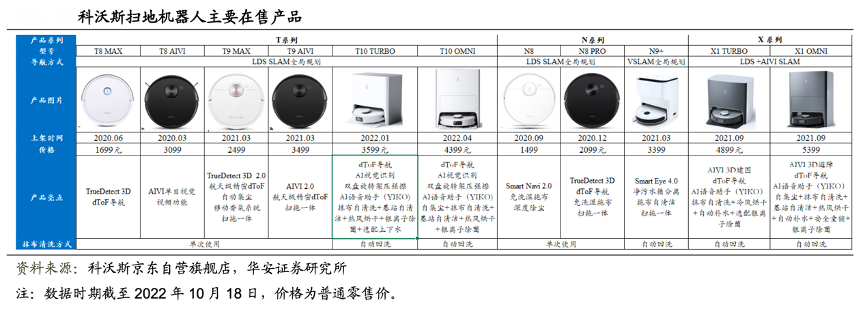 經典案例:根據科沃斯京東自營旗艦店、華安證券研究所等綜合資訊表明,科沃斯公司掃地機器人主要在售產品包括一點的 K 系列和科沃斯的 T 系列、N 系列和 X 系 列,價格段從 799-5399 元不等,技術方面,公司產品力持續領先,是市 場上為數不多地同時擁有 LDS SLAM 和 VSLAM 全局規劃產品的領先企業,公司產品的 導航方式涵蓋了市面上主流前沿技術,包括 D-ToF 激光導航、AIVI 視覺導航和 3D 結構 光導航,可實現掃地、拖地、自清潔、自集塵等多種功能,持續為用戶創造價值增量。