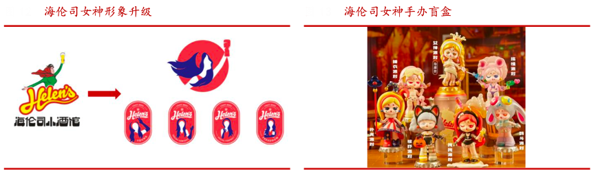 經典案例:根據華西證券研究所等綜合資訊表明,原有海倫司的標識色彩復雜,文化屬性帶有強烈的東歐風格,與年輕人調性相背離。升級后的標識呈現了年輕時尚的海倫司女神形象,色彩簡單且有記憶點,并延伸 IP 化元素使海倫司女神活化,成為品牌的靈魂代表。為深化海倫司女神 IP 形象,海倫司跟隨新興浪潮推出了手辦盲盒。