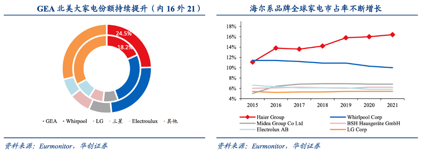 經(jīng)典案例:根據(jù)Eurmonitor、華創(chuàng)證券等綜合資訊表明,海爾自 2011 年起陸續(xù)兼并收購三洋白電、GEA、FPA、Candy 等海外優(yōu)質資產(chǎn),完成全球品牌的搶占收購,并充分發(fā)揮與各地品牌的協(xié)同效應。以 GEA 為例,雙方基于產(chǎn)品結構、市場區(qū)域差異性,通過各類協(xié)同實現(xiàn)了冰洗廚電優(yōu)勢互補,GEA 北美市占率穩(wěn)步提升。