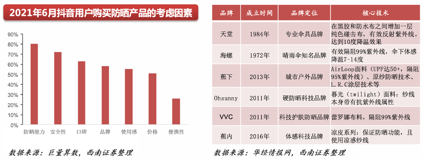 經典案例:根據巨量算數、華經情報網、西南證券等綜合資訊表明,目前國內市場上頭部防曬服飾品牌均具有其各自核心防曬技術,例如蕉下具有L.R.C涂層(主要為鈦氧化物紫外線反射劑)能實現UPF50+,而Ohsunny紗線本身采用雷 羅娜布料,可以隔阻99%紫外線。