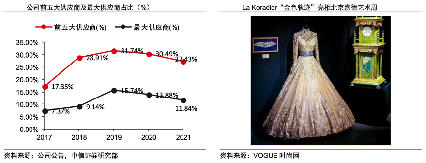 經典案例:根據公司公告、VOGUE時尚網、中信證券研究部等綜合資訊表明,截至2021年贏家時尚公司前五大供應商占 比 27.43%,最大供應商占比 11.84%,2021 年公司旗下各大品牌均發布多款創意設計,例如 Koradior 與意大利設計師洛倫佐·瑪利亞·維奇羅合作推出的的“法國玫瑰”系列、La Koradior 與國內知名設計師彭晶聯名設計的“傳世臻藏”百萬禮服“金色軌跡”。